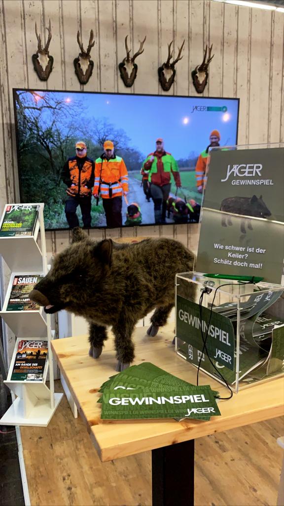 Jeder Besucher konnte den Plüschkeiler hochheben und schätzen, wie viel dieser wiegt. Wer seine Schätzung aufschrieb und in unsere Gewinnspielbox schmiss, konnte abräumen. Es gab Jagdausrüstung im Wert von 1000 Euro zu gewinnen. Dafür musste die Schätzung nah am Gewicht liegen. Und wie viel wiegt er nun?