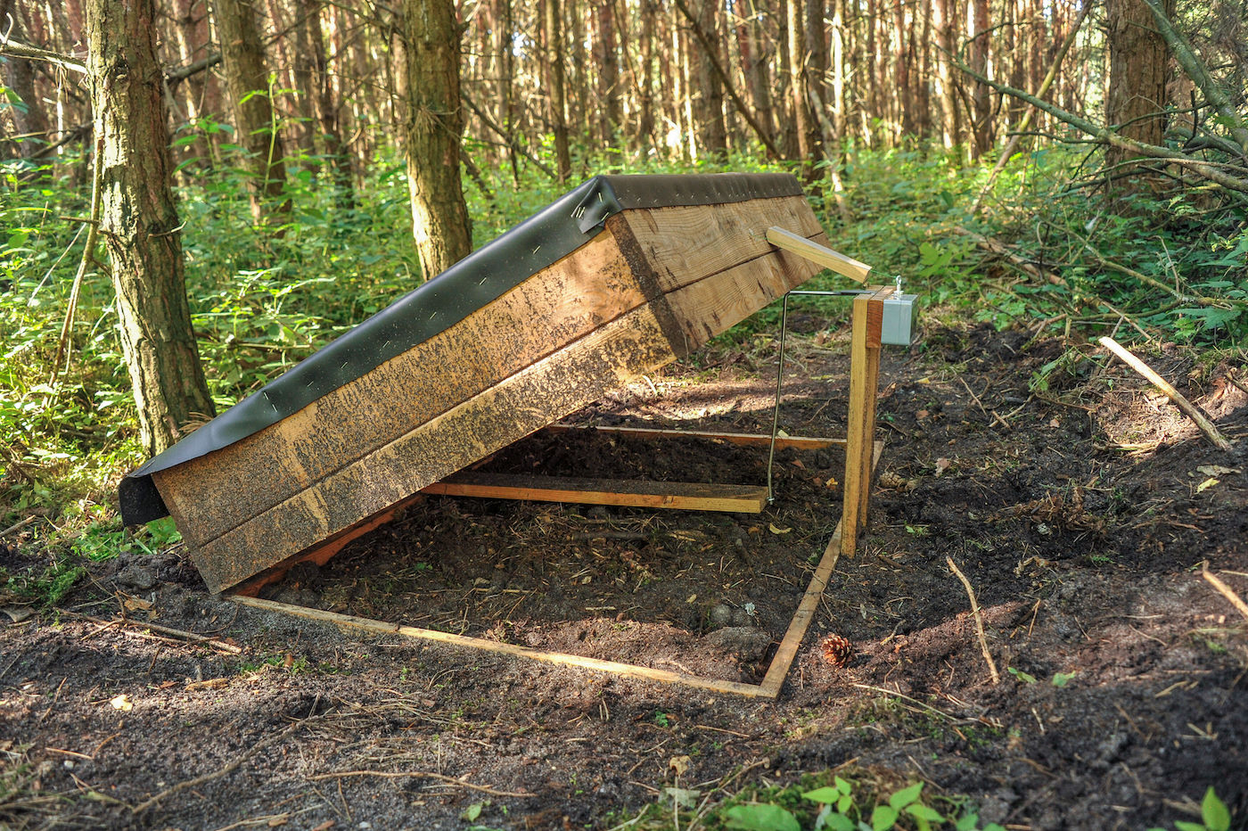 Auch in alleinliegenden Gebäuden lassen sich solche Fallen gut aufstellen. Meist umgibt die Falle ein Kasten. Dieser kann mit Erde, Mist oder auch Holz verblendet werden. So wird die Falle schnell ein Teil der Landschaft. Ein Köder hilft, das unschlüssige Raubwild in die Mitte der Falle zu locken. Je nach Standort funktioniert es aber auch ohne ganz gut.