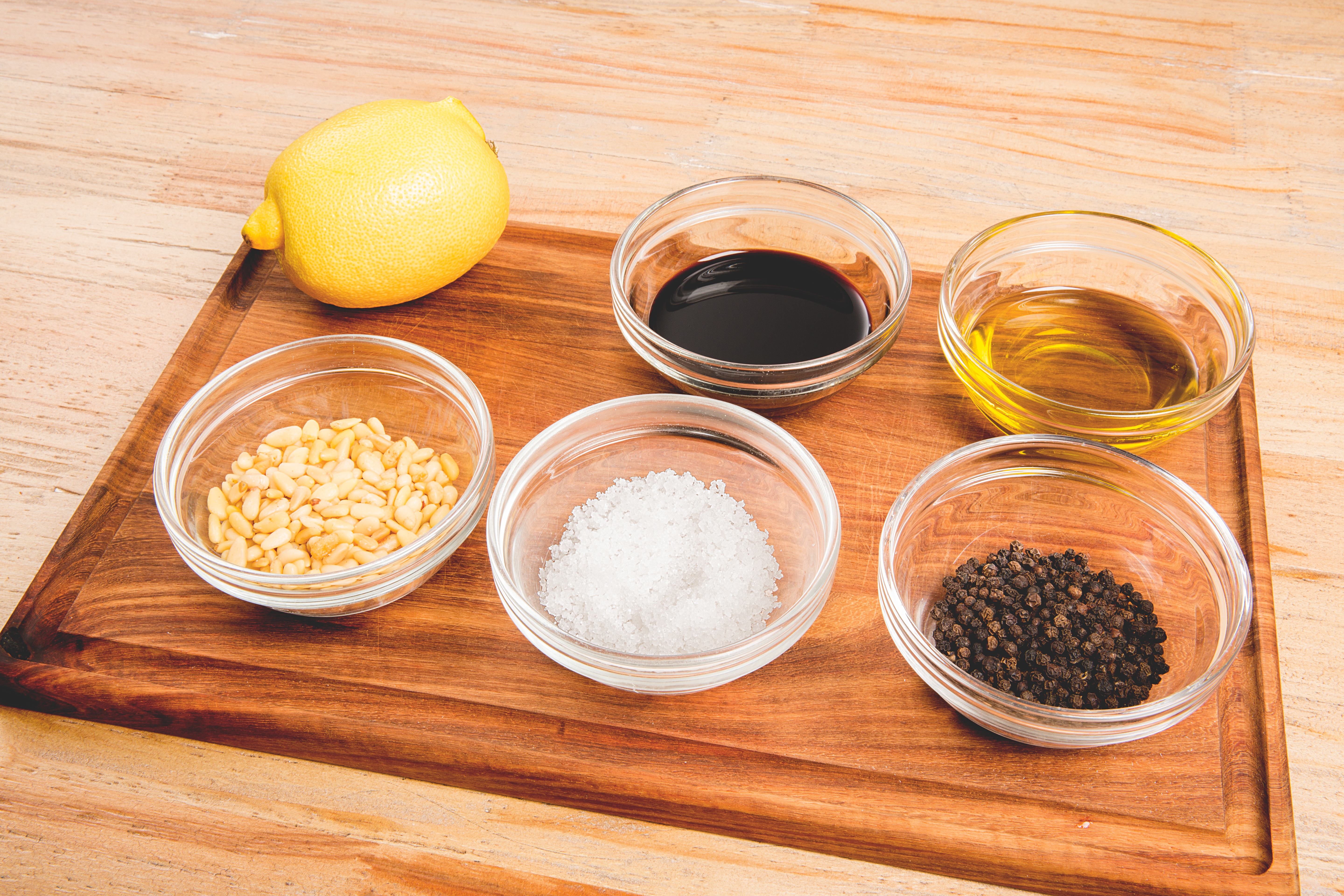 - Neben Rucolaslat und dem Wildbret benötigen wir noch: Zitronensaft, Balsamico-Essig, natives Olivenöl, Pinienkerne, Meersalz und Pfeffer ©Pauline v. Hardenberg
