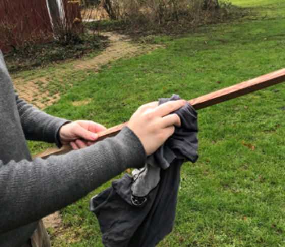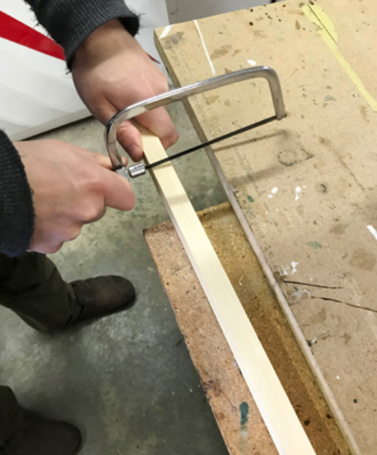 Die vier Holzstäbe für den Zielstock werden zunächst auf Länge gesägt. Als groben Anhaltspunkt für die Länge dient die eigene Augenhöhe, so erhält man bereits sehr gute Abmessungen für den späteren Anschlag.