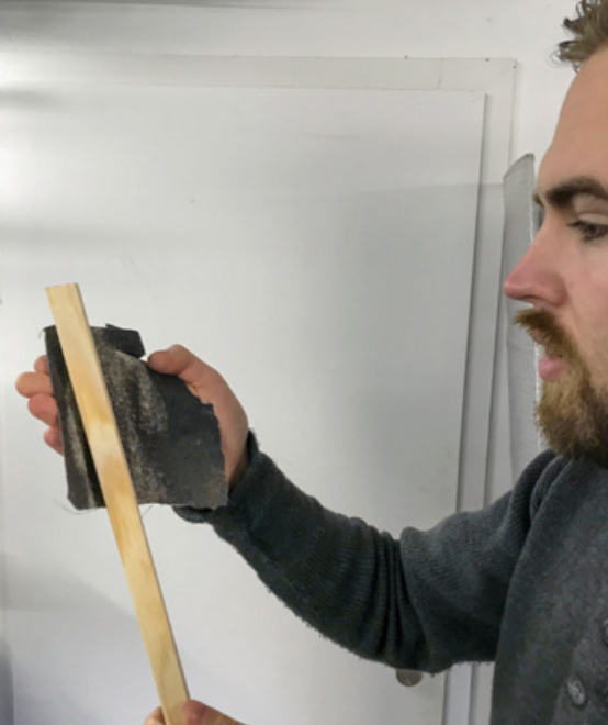 Die zugesägten Stäbe werden nun mit grobem Schleifpapier etwas abgerundet. Im gleichen Zuge kann man Stellen, an denen Splitter herausstehen könnten, intensiv bearbeiten. Die Haptik wird dadurch besser.