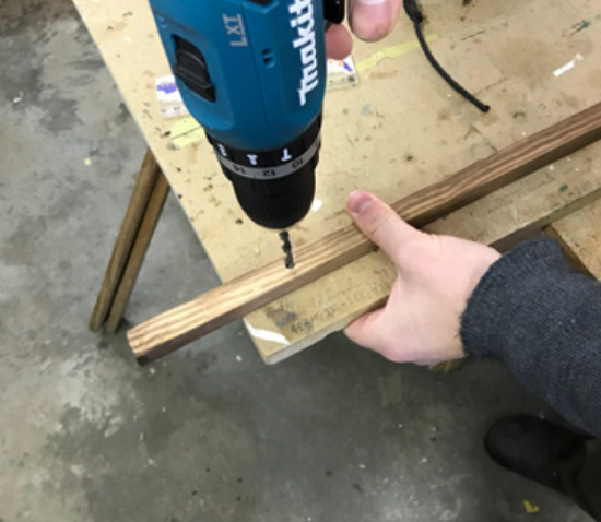 11 cm von einem Ende der Stäbe werden nun passende Löcher gebohrt. Damit der Bohrer nicht verrutscht, empfiehlt es sich, die Position mit einem spitzen Gegenstand (Körner) zu markieren.