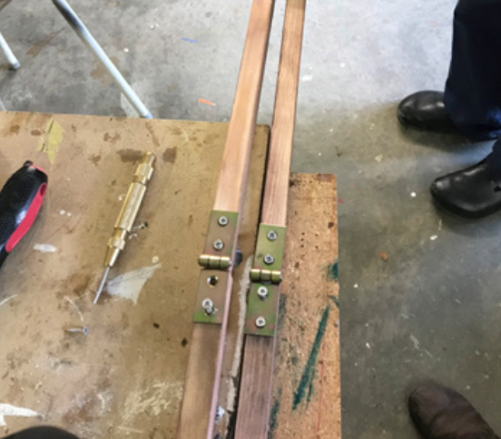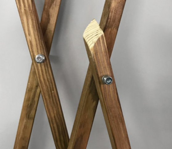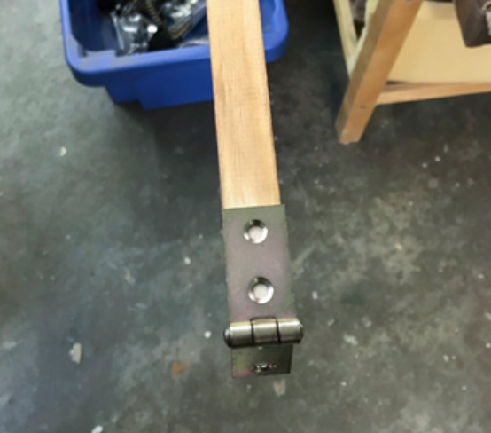 An dem vorderen Zielstock werden nun am unteren Ende die Scharniere verschraubt. Vorsicht! Die Schraubpunkte sollten dringend vorgebohrt werden, da das Risiko sehr hoch ist, dass der Holzstab aufplatzt.