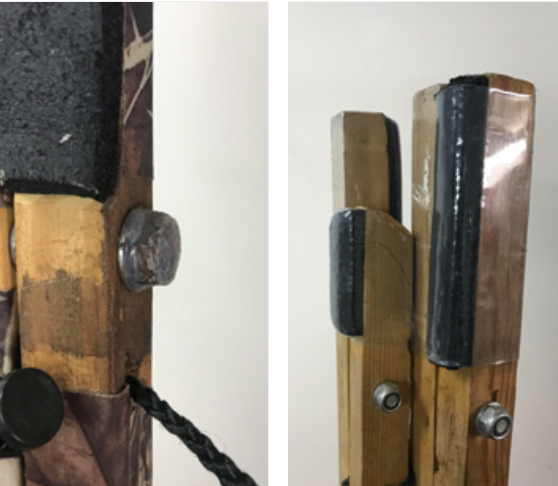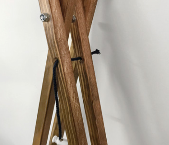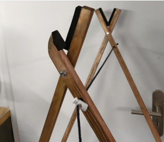 Mit einer Kordel werden unterhalb der Drehpunkte Verbindungen geschaffen, indem man auf den jeweils innenliegenden Stäben Löcher bohrt und am vorderen Zielstock verknotet. Hinten hilft ein flexibler Stopper.