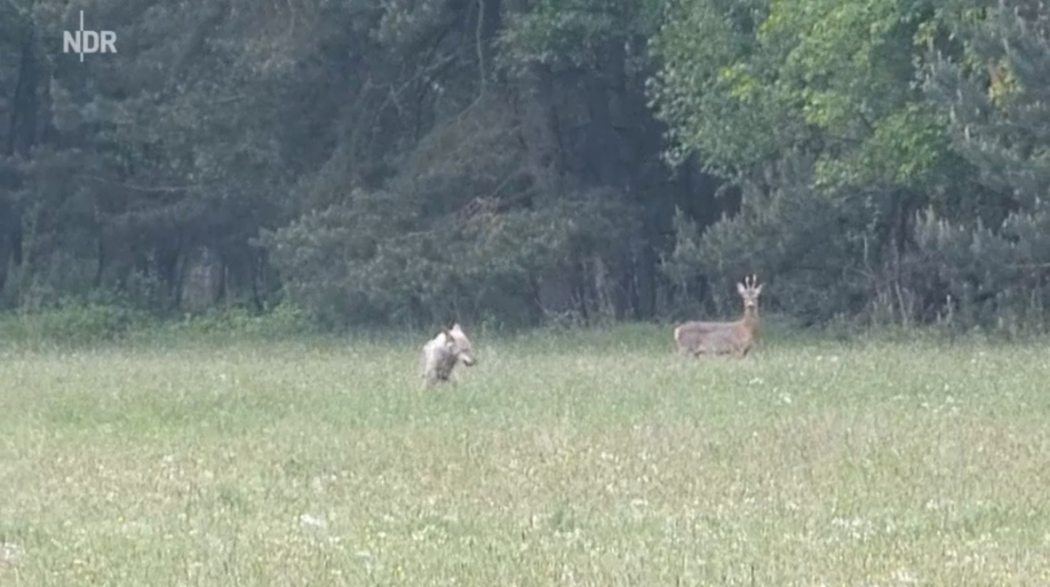 Burgwedel (Niedersachsen): In den frühen Morgenstunden des 19. Mai war der Wildtiermaler Werner Siemers mit seinem Fahrrad im nördlichen Umland von Hannover bei Burgwedel unterwegs, um nach neuen Motiven Ausschau zu halten. Die Aufmerksamkeit des langjährigen Jägers wurde jedoch auf ein Wiese gelenkt, auf der er nach eigenen Angaben einen Wolf ausmachen konnte. Wolfssichtungen im Raum Hannover sind dieser Tage nichts Neues, jedoch gelang es Herrn Siemers einen frischen Riss zu filmen. Beachtenswert ist dabei zusätzlich, dass ein junger, starker Rehbock die Szene beobachtet. Sieht es Anfangs noch so aus, als würde der Bock die Flucht ergreifen, so behält er doch den Wolf im Blick und schreckt mehrfach. Die Neugier und Unerfahrenheit des jungen Bockes mag hierbei für dieses Verhalten als Erklärung dienen.