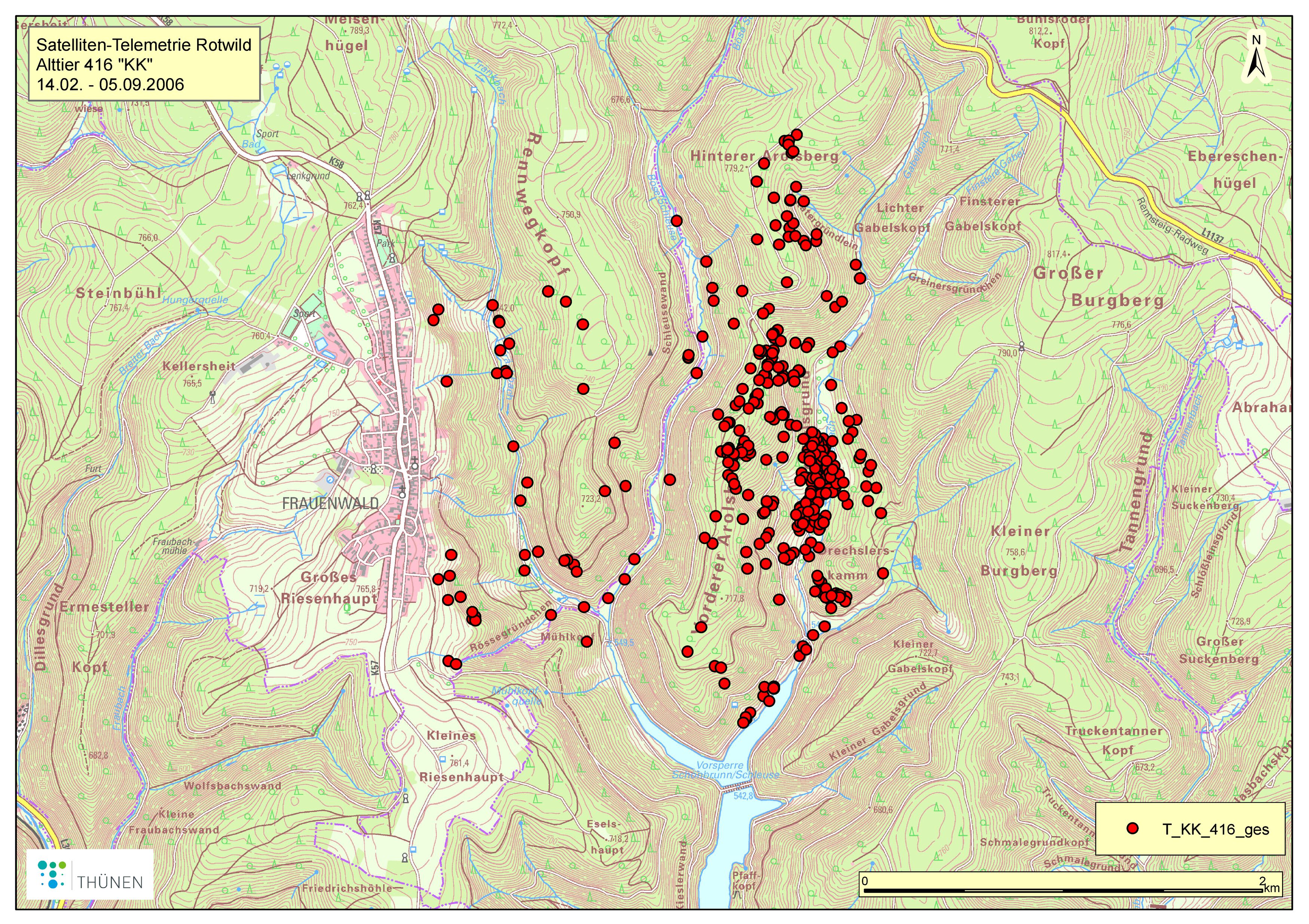 Seit über 20 Jahren werden am Thünen Institut für Waldökosysteme in Eberswalde Satellitentelemetriestudien an Rotwild in unterschiedlichen Lebensräumen durchgeführt. Allein im Thüringer Wald wurden in Gemeinschaftsarbeit mit vielen Beteiligten über 60 Stücke Rotwild besendert und beobachtet. Viele interessante Ergebnisse sind dazu schon veröffentlicht und fanden Berücksichtigung bei jagdrechtlichen Entscheidungen.